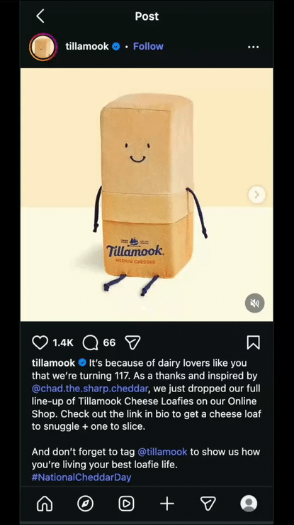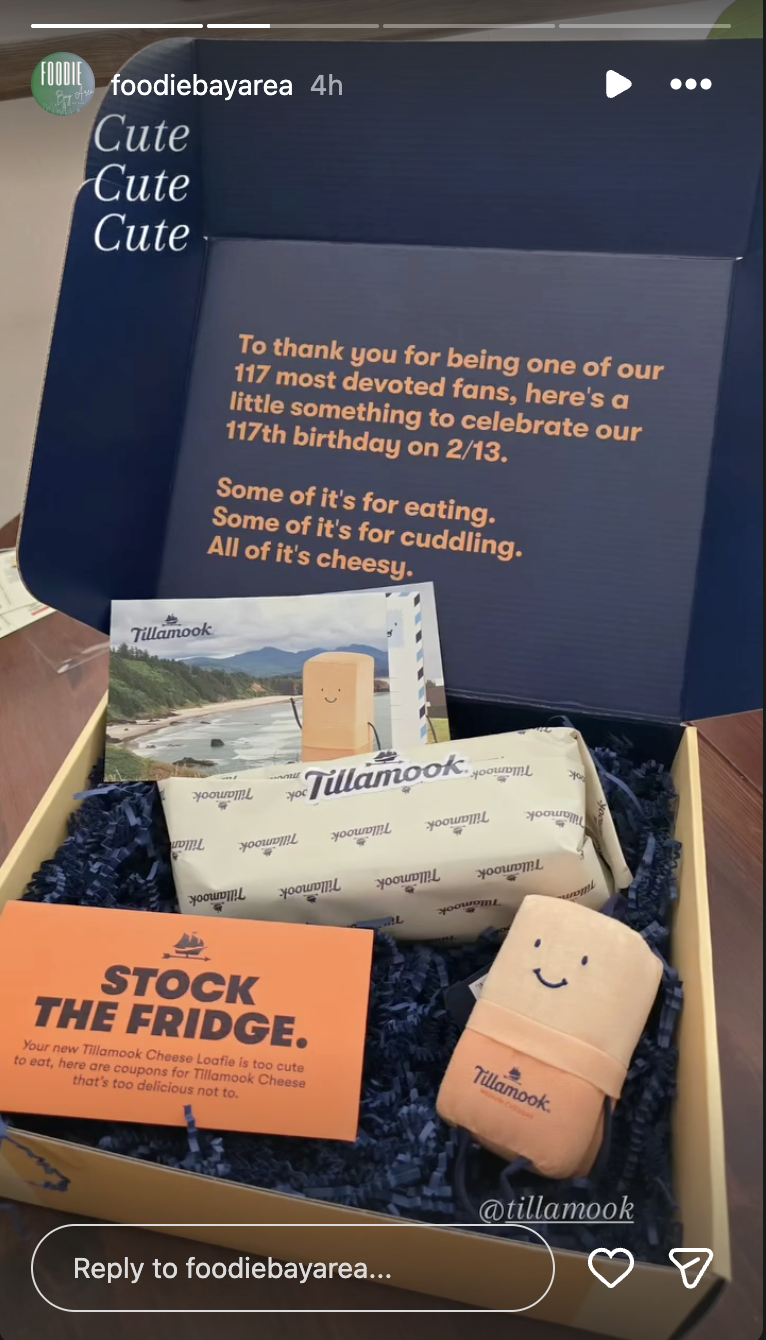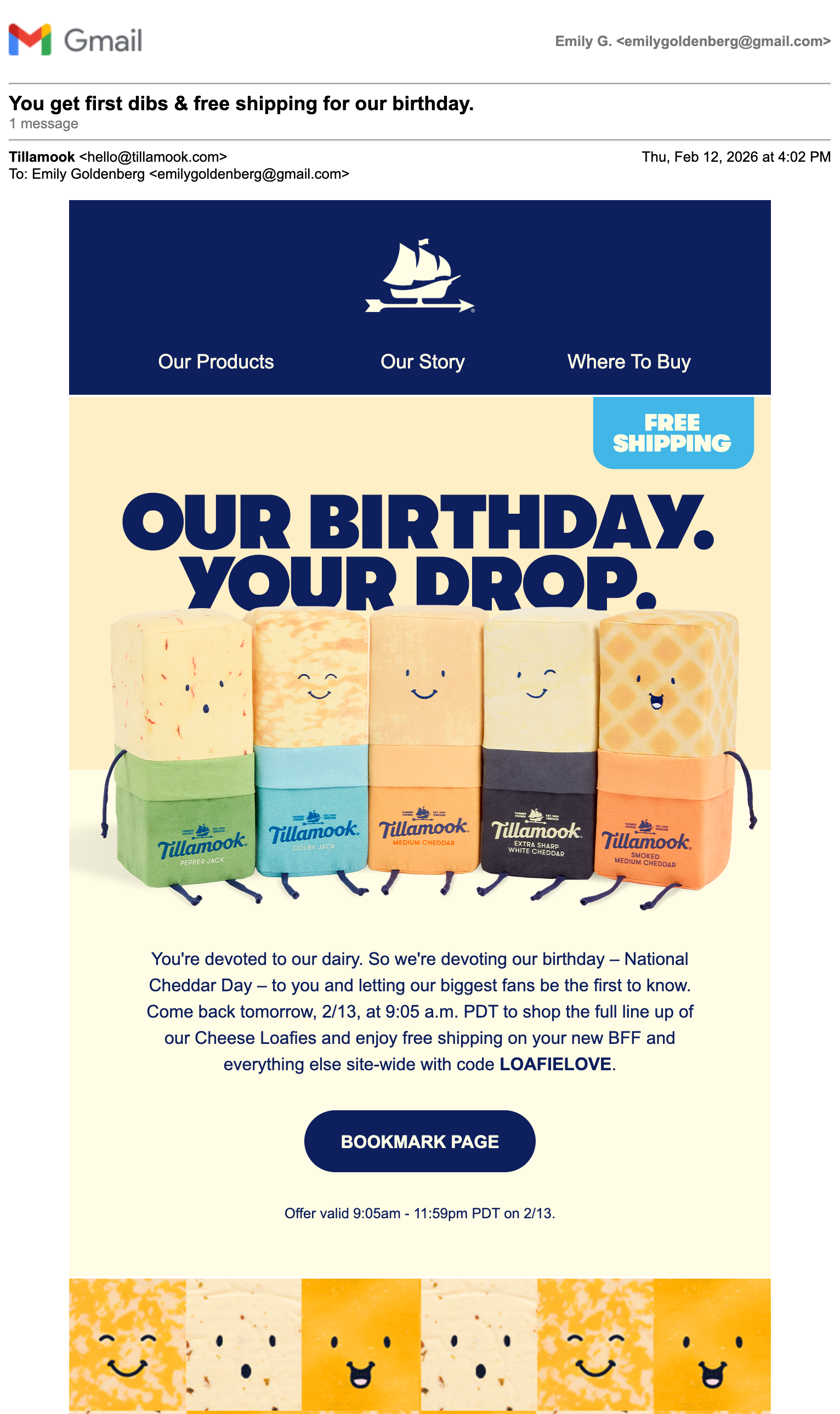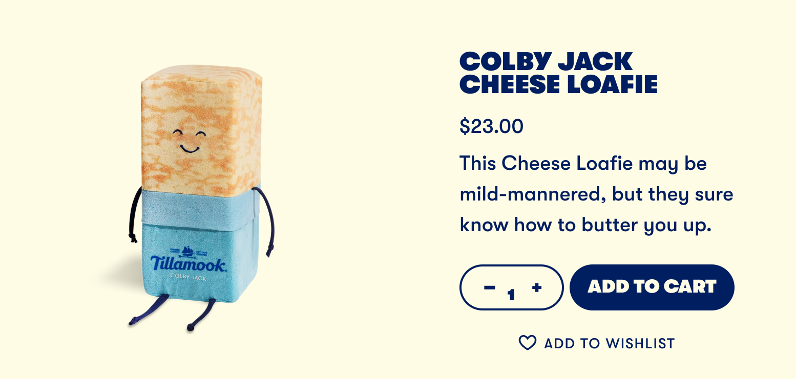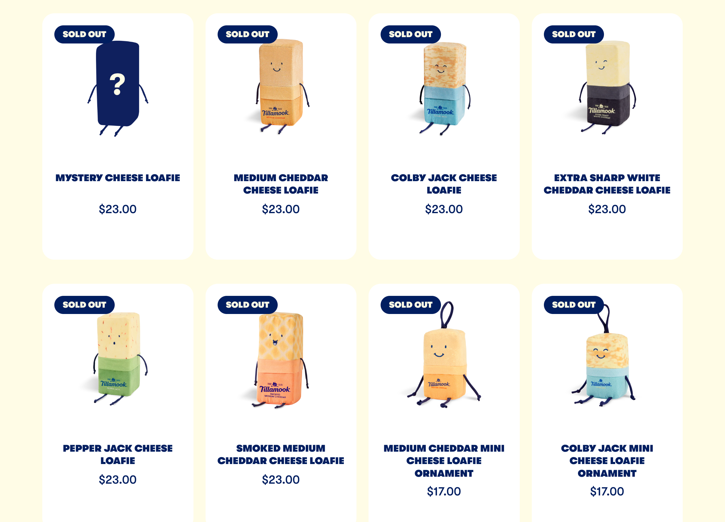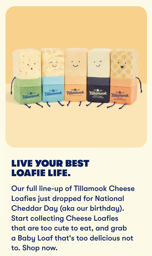 To capitalize on the plushie trend—and reward their passionate fans—Tillamook decided to release their new lineup of adorable cheese loaf stuffies on their 117th birthday, February 13. I was tasked with naming them, along with creating all messaging for the launch.